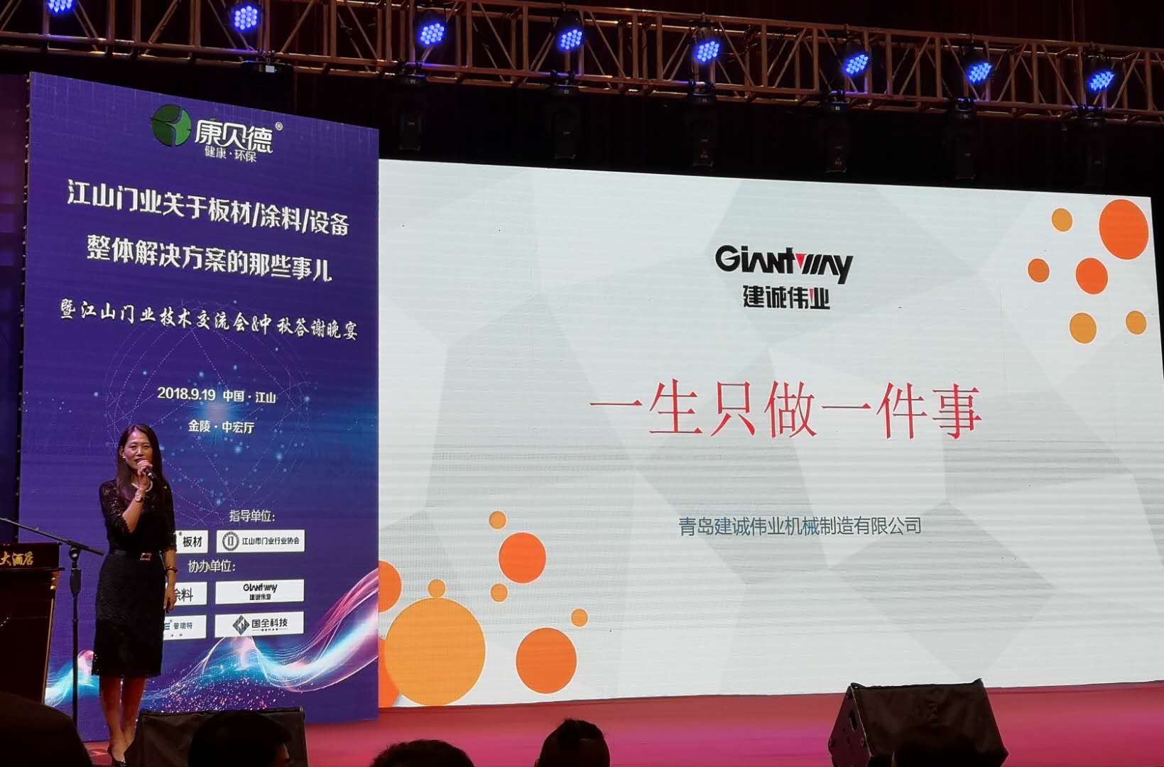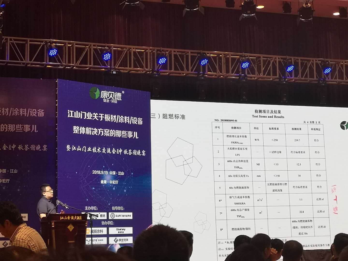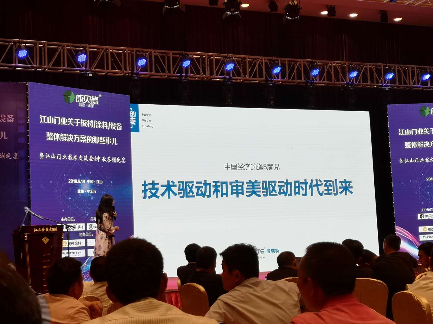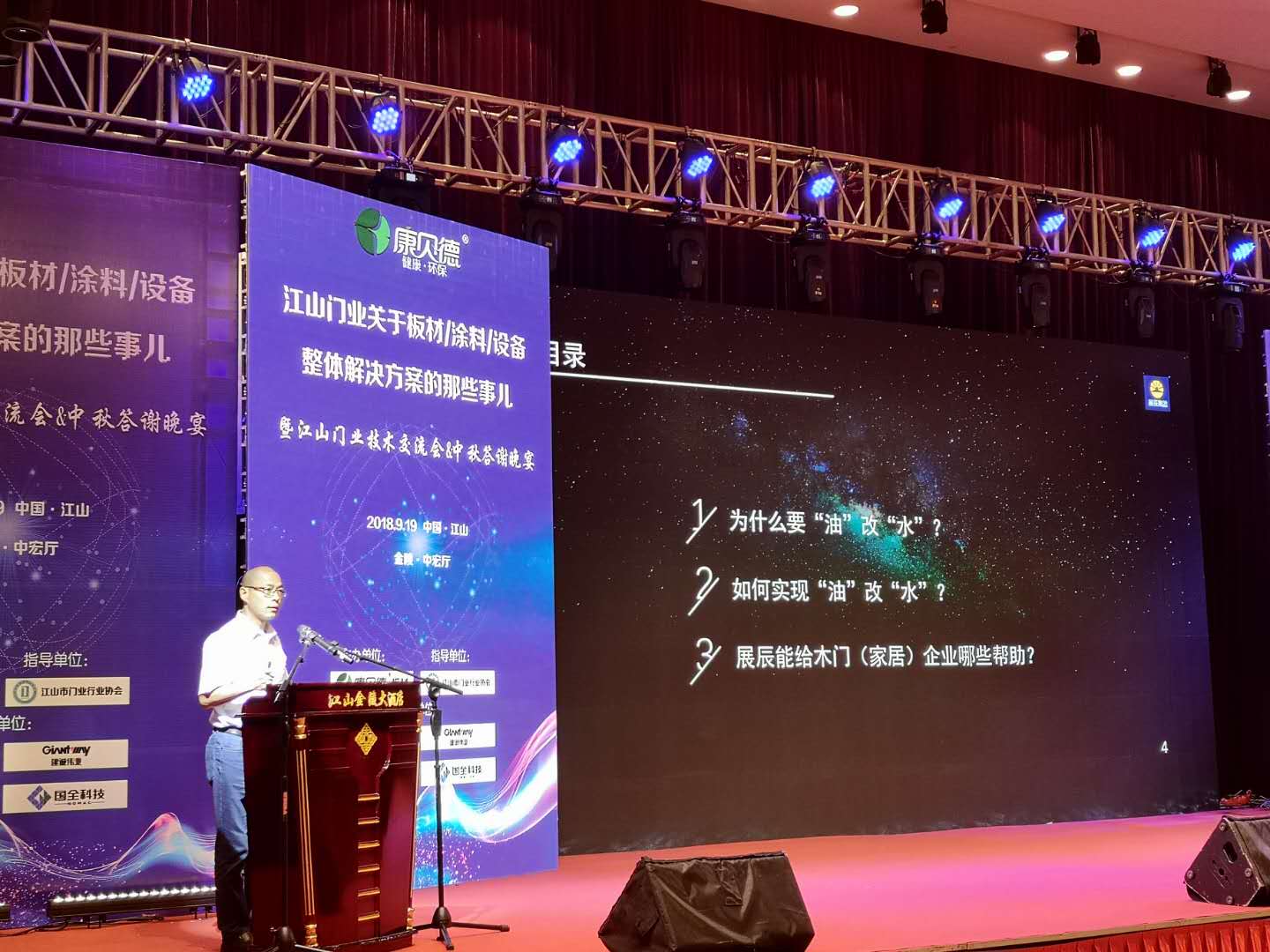 2018年9月19日,由康貝德板材主辦,江山市門業行業協會指導,展辰涂料、普瑞特Uv滾涂、建誠偉業砂光機及國全科技協辦的江山門業技術交流會(關于板材/涂料/設備整體解決方案那些事兒)在金陵大酒店中宏廳舉行。