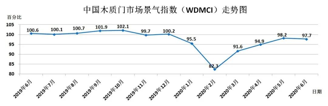 中國木材與木制品流通協會木門窗專業委員會發布:2020年6月份中國木質門市場景氣指數WDMCI(Wooden Door Market Climate Index)為97.7(見圖), 環比下降0.5%,同比下降2.9%。受家居市場傳統淡季及夏季雨水多影響,本月WDMCI在連續3個月上漲后,出現小幅下滑,同比去年上半年景氣情況有所差距。