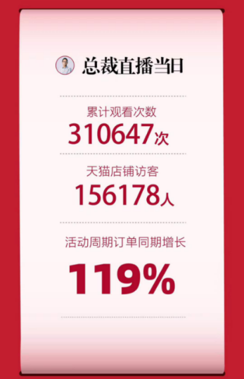 5月5日,TATA木門董事長縱瑞原直播首秀,當日累計31萬人次觀看,天貓旗艦店訪客達15.6萬人,單日成交超過1萬單,活動周期訂單比同期增長119%。