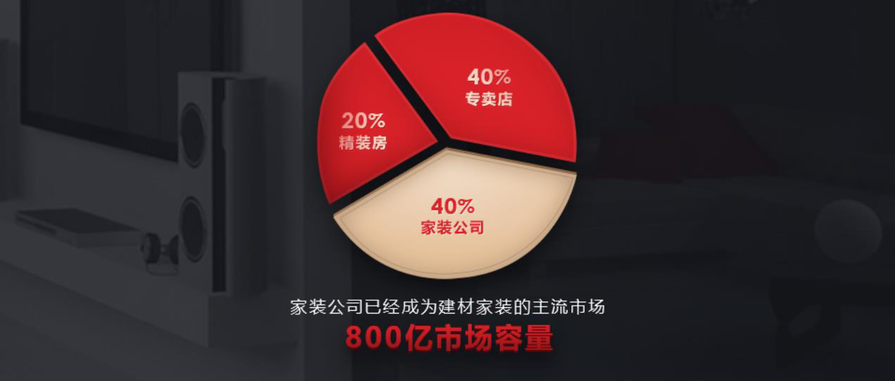 隨著國家"成品房"(相對于毛胚房)政策的出臺,木門行業的市場需求也更加空前旺盛。2000億的建材家裝行業,裝修公司和線下店各占據約40%的市場份額,而現有體量還遠遠無法滿足市場需求,未來發展前景十分廣闊。